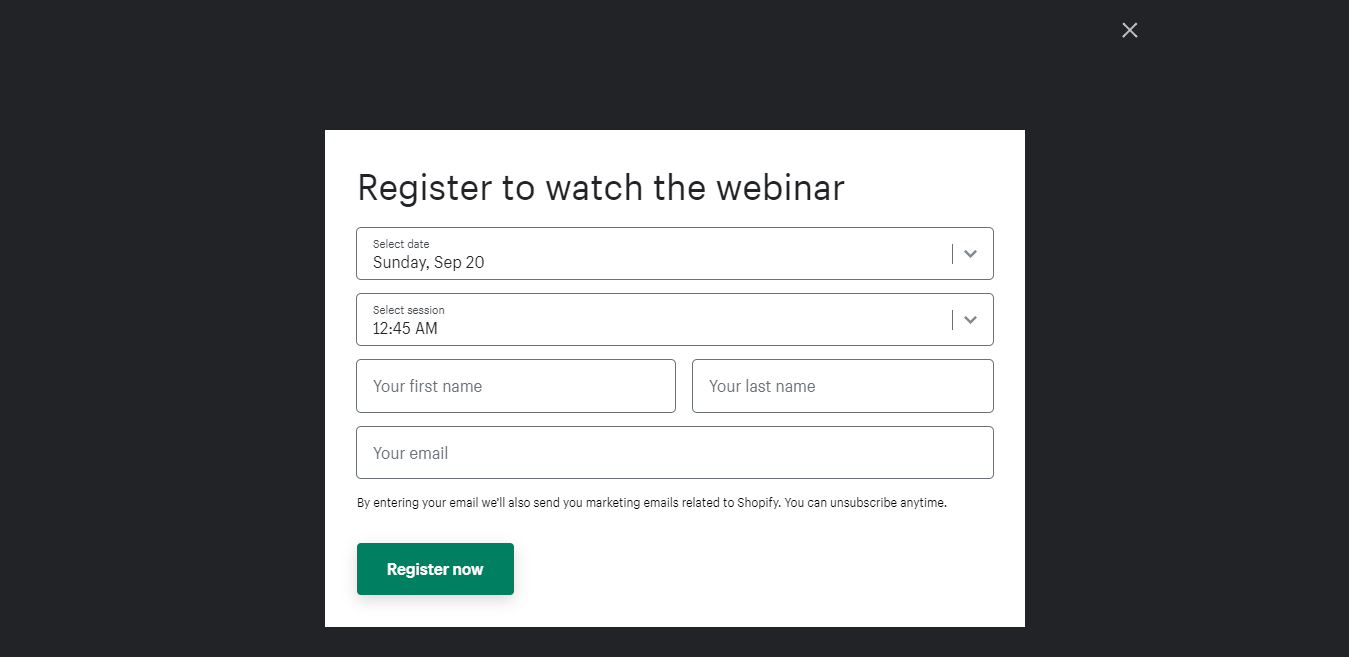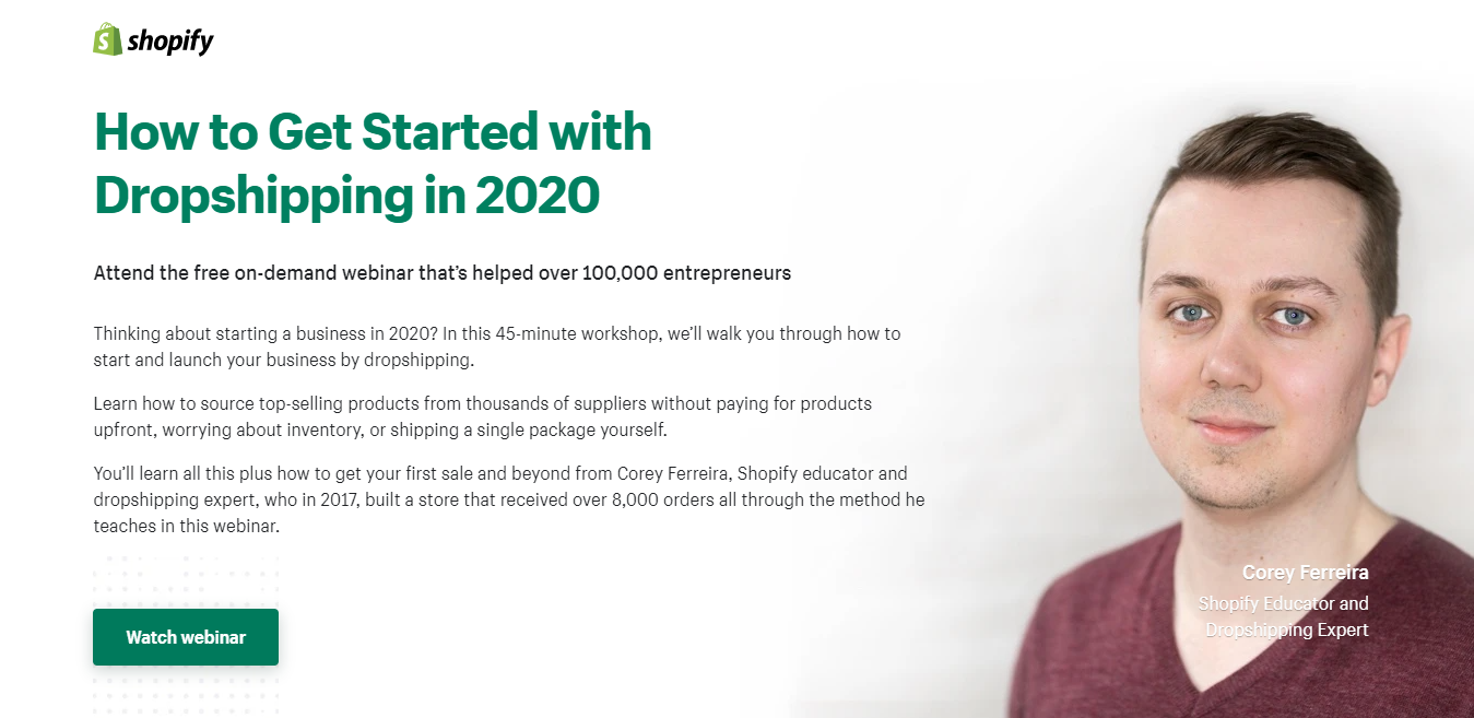 Here’s an example of a well-designed landing page by Shopify. The landing page talks about a free webinar. They’ve used a compelling headline and teamed it up with crisp copy outlining the benefits of viewing the webinar.