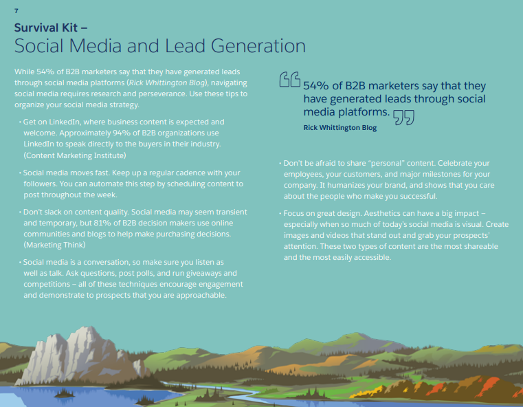 Here’s a good example of an eBook by Pardot on lead generation. Notice how they use colors, visuals, and text-boxes to emphasize information and engage readers.