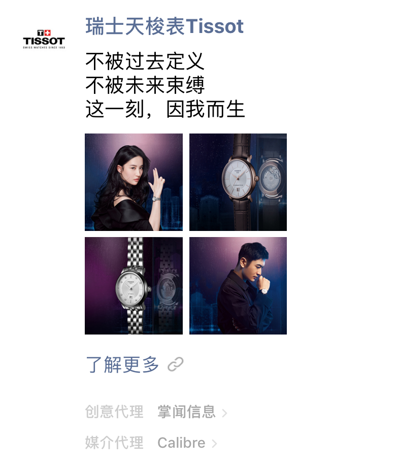 A WeChat Moments ad consists of the brand name, logo, ad copy, and banner. Clicking on the ad will lead you to a landing page.