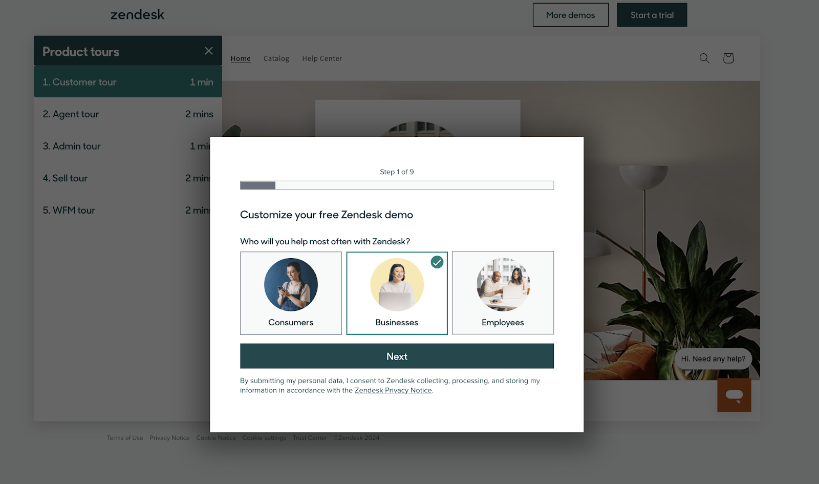 But Zendesk recently quit offering personalized demos to their general audience (I’m sure they offer demos for enterprise leads) and instead offer self-guided tours and on-demand demo videos.