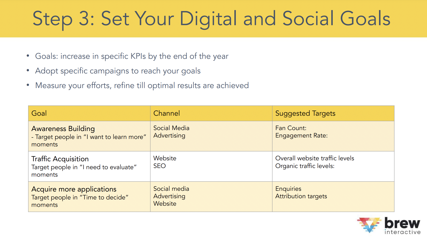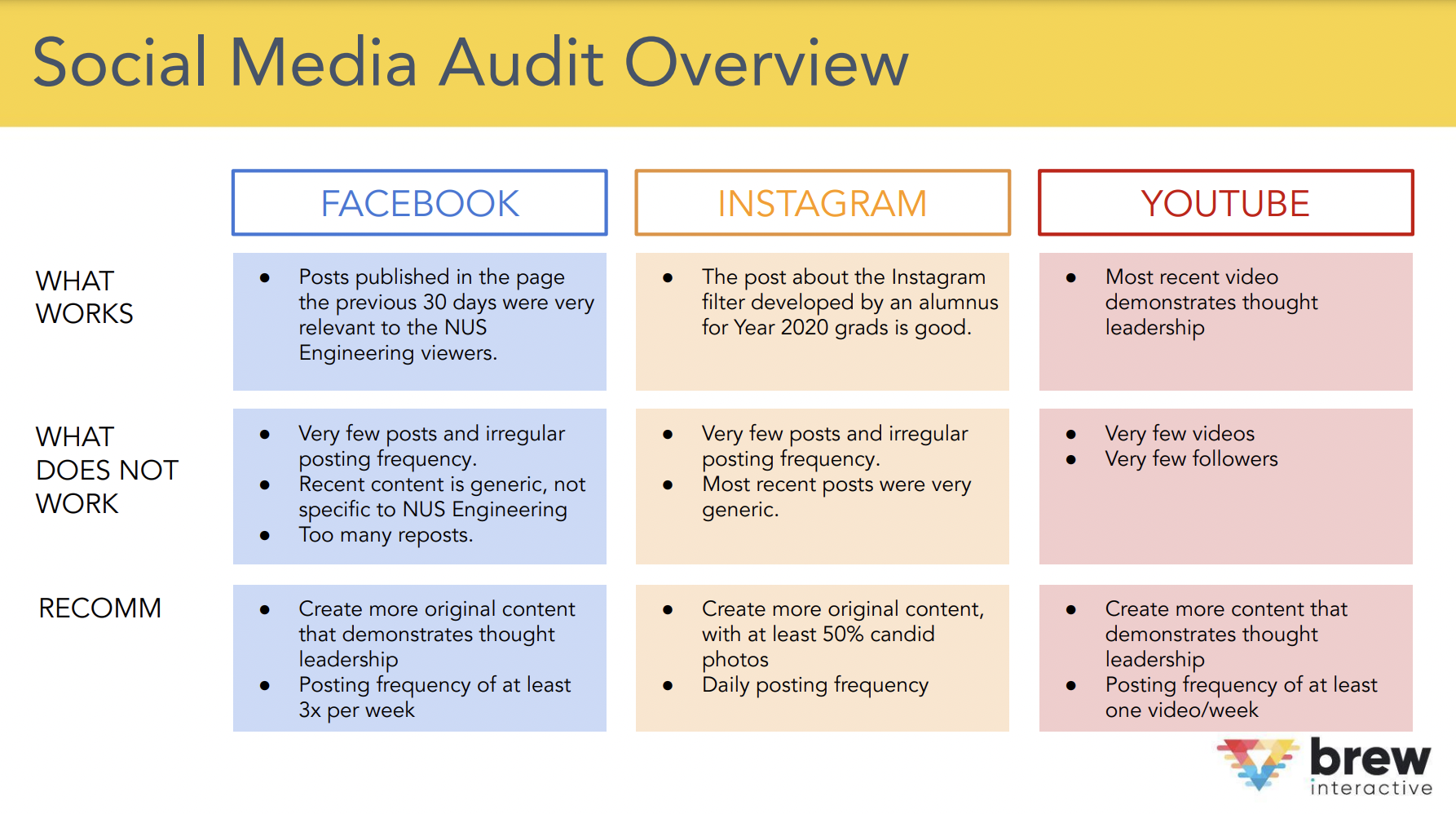 Next, we evaluated all of NUS’ current marketing efforts to determine what was working and what wasn’t. We looked at each individual department to investigate their social media use, outreach efforts, and other marketing tactics.