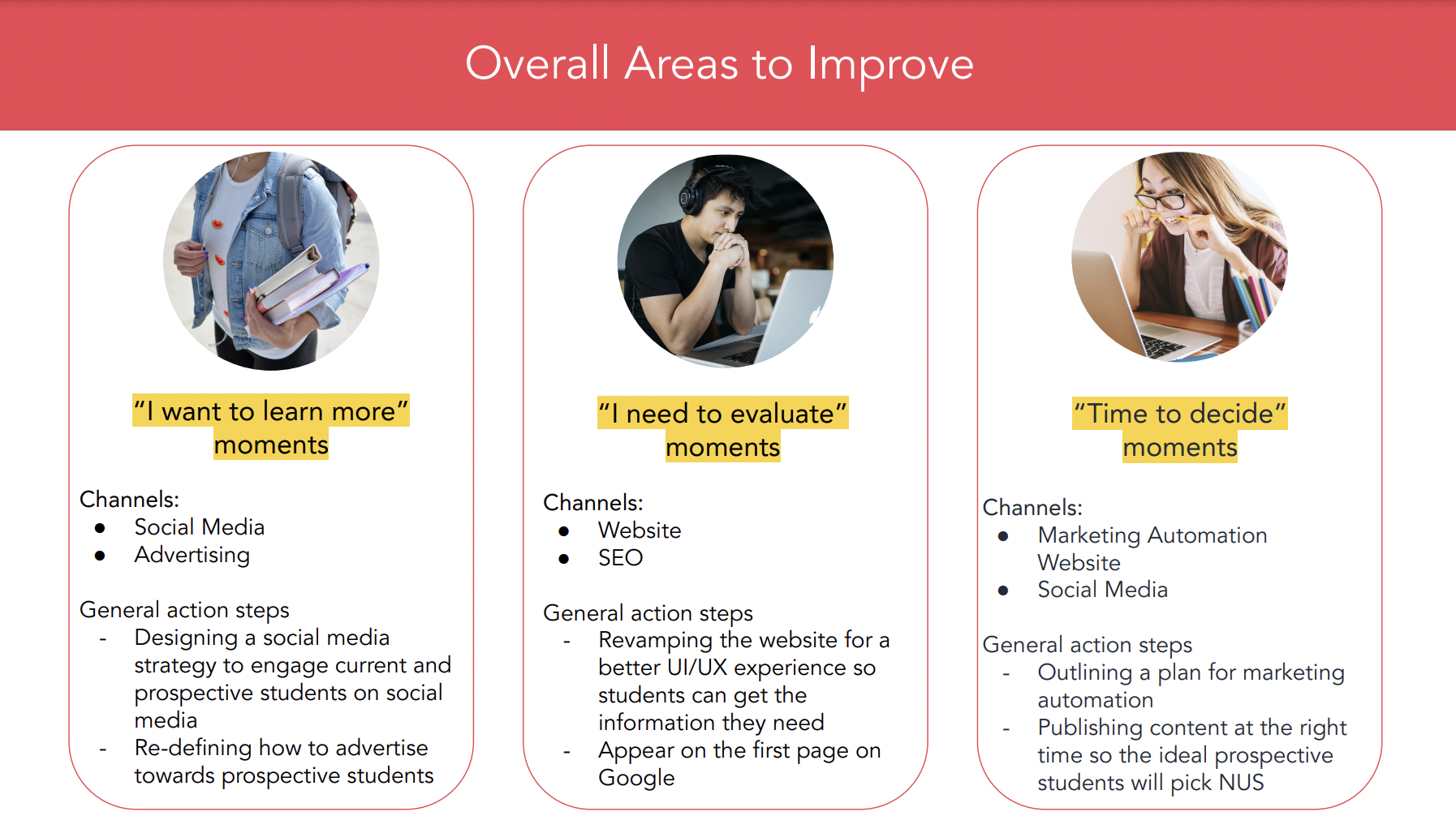 We identified the three biggest areas in their “buying process” (a student’s journey to applying to and attending NUS) that needed drastic improvement.